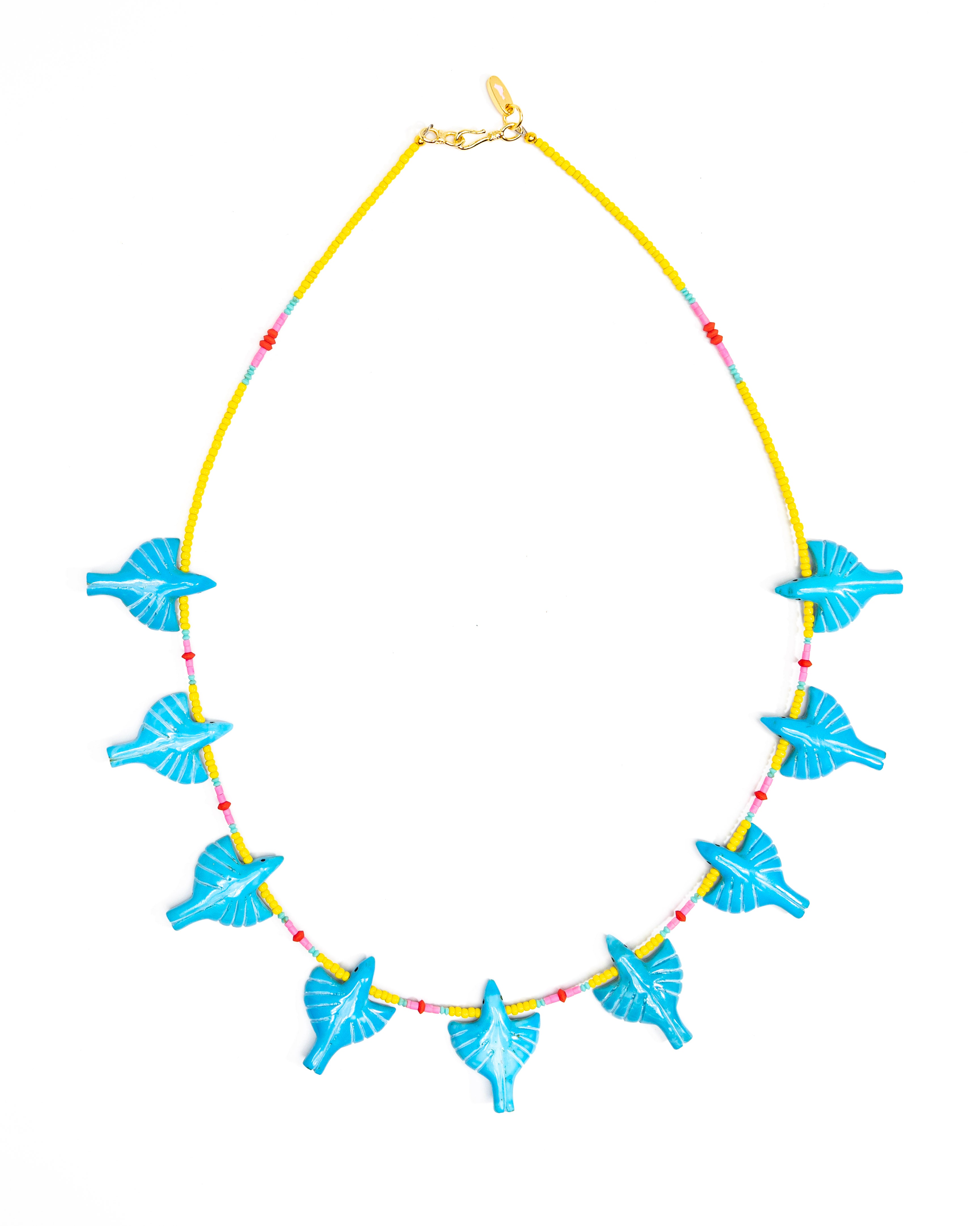 Nine turquoise birds mixed with yellow African beads, pink and red clay spacers. Measures 24” long.