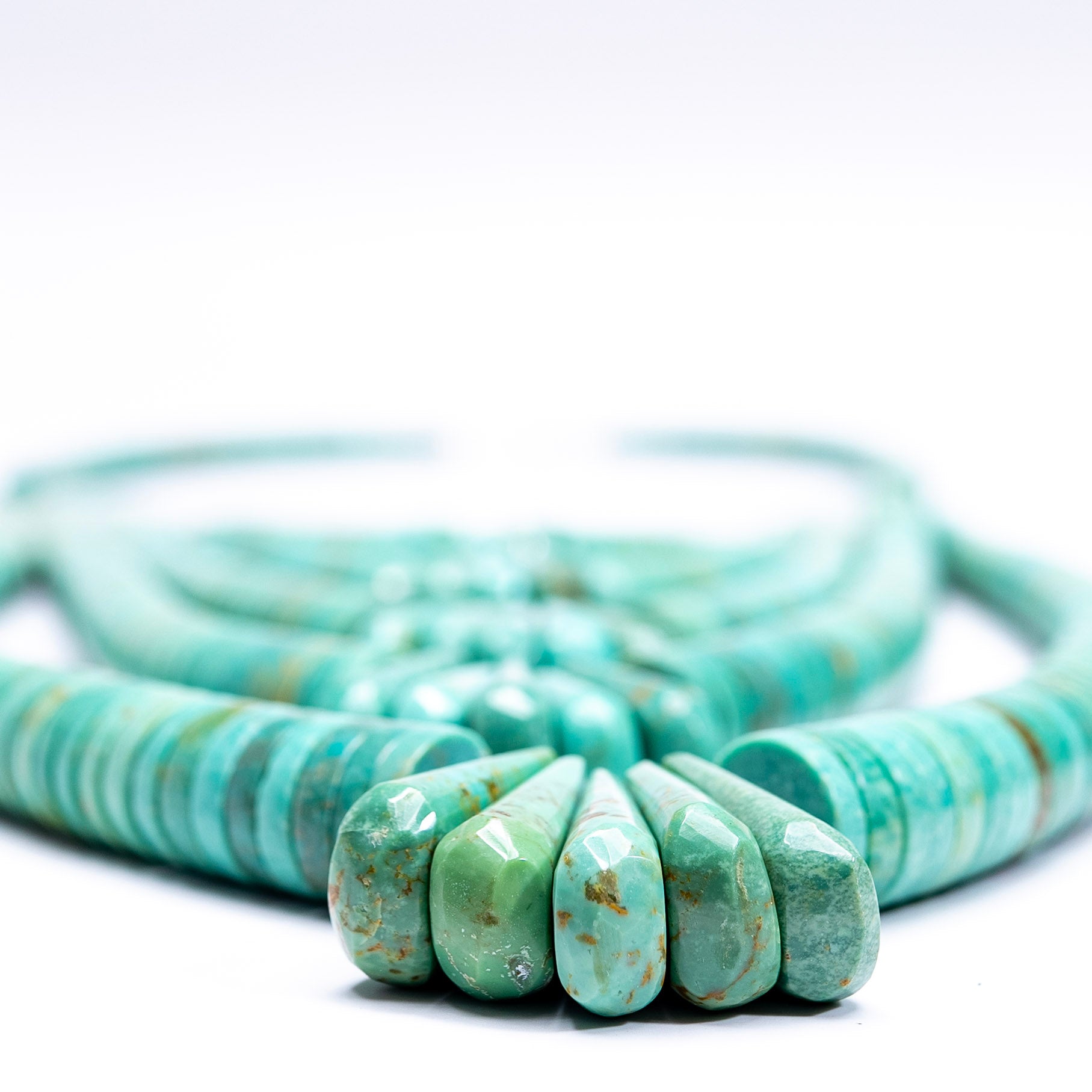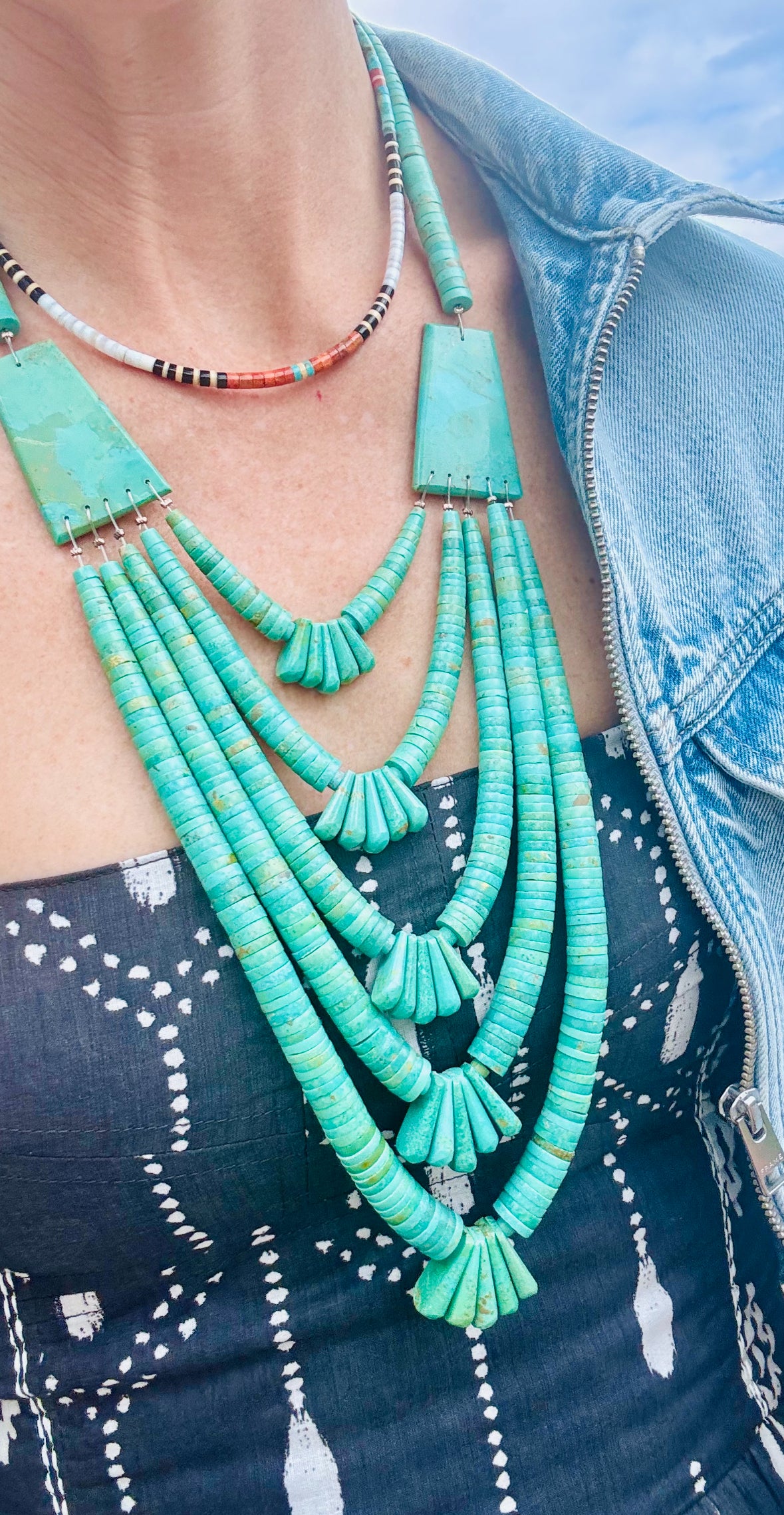 Vintage authentic turquoise five strand necklace. Shortest strand measures 20" with total drop from clasp to bottom measuring 17".