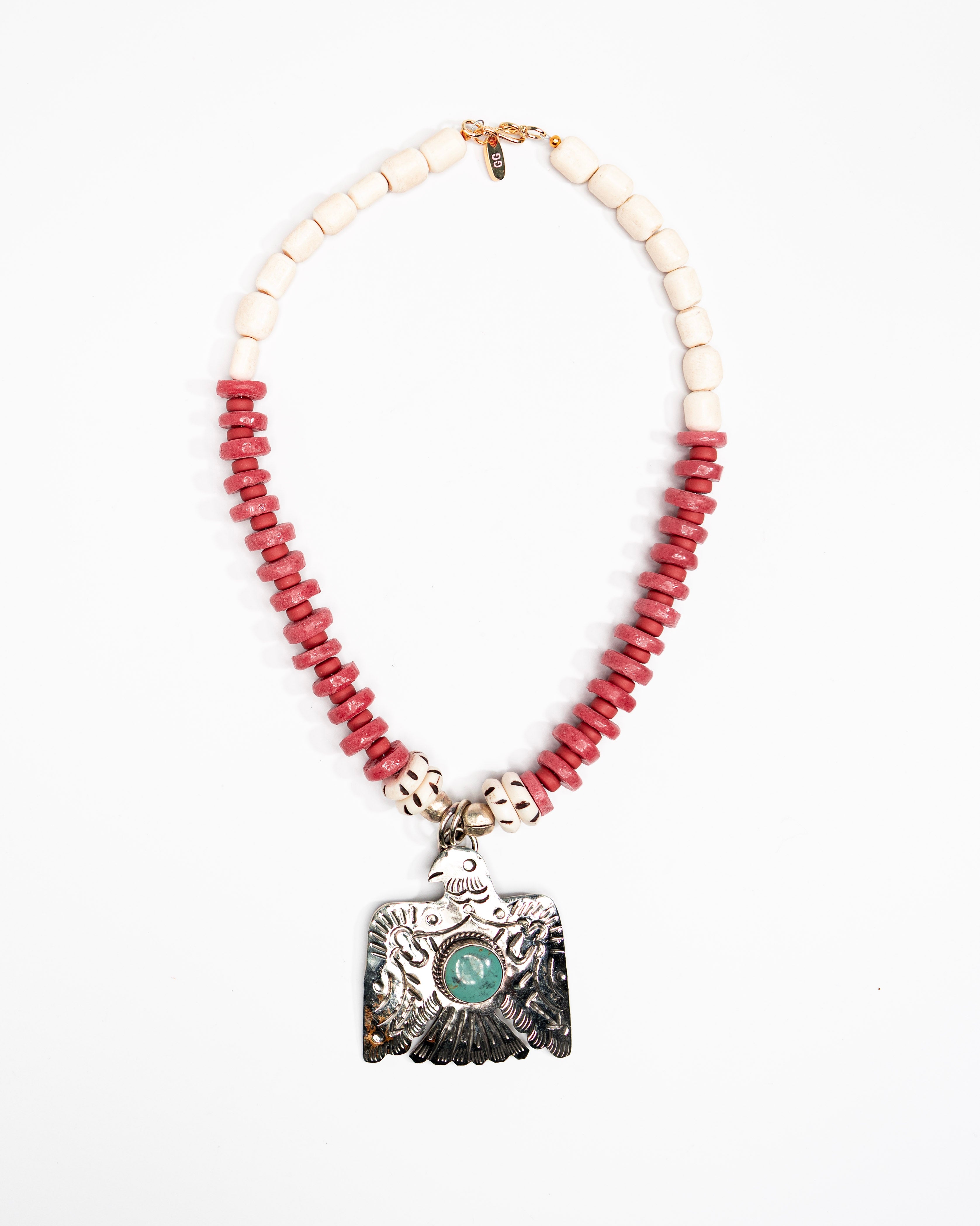 Metal eagle pendant with turquoise inlay mixed with pink African beads and red spacers. Measures approximately 17" long.